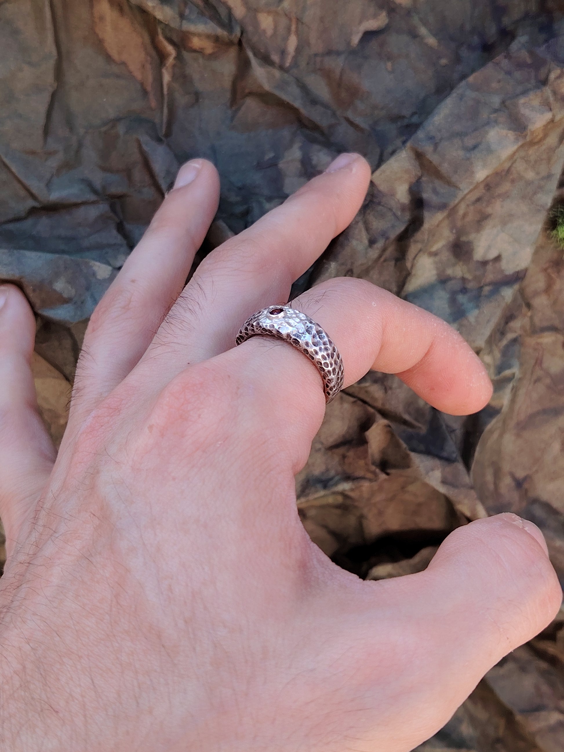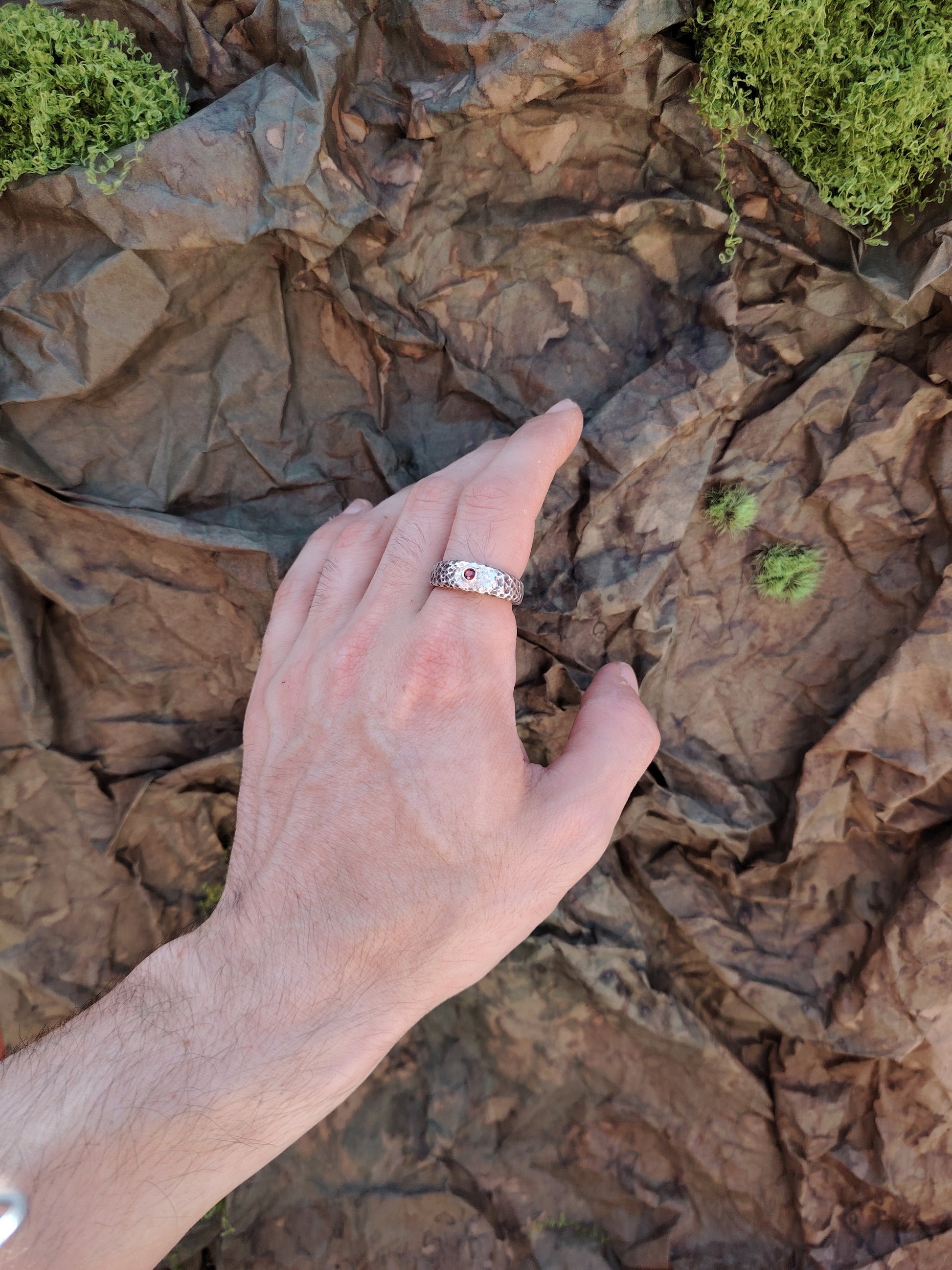 Anello in argento 925 con granato rosso, realizzato a mano. Ispirato alla pelle squamosa dei giganti, antichi e leggendari rettili sputafuoco.