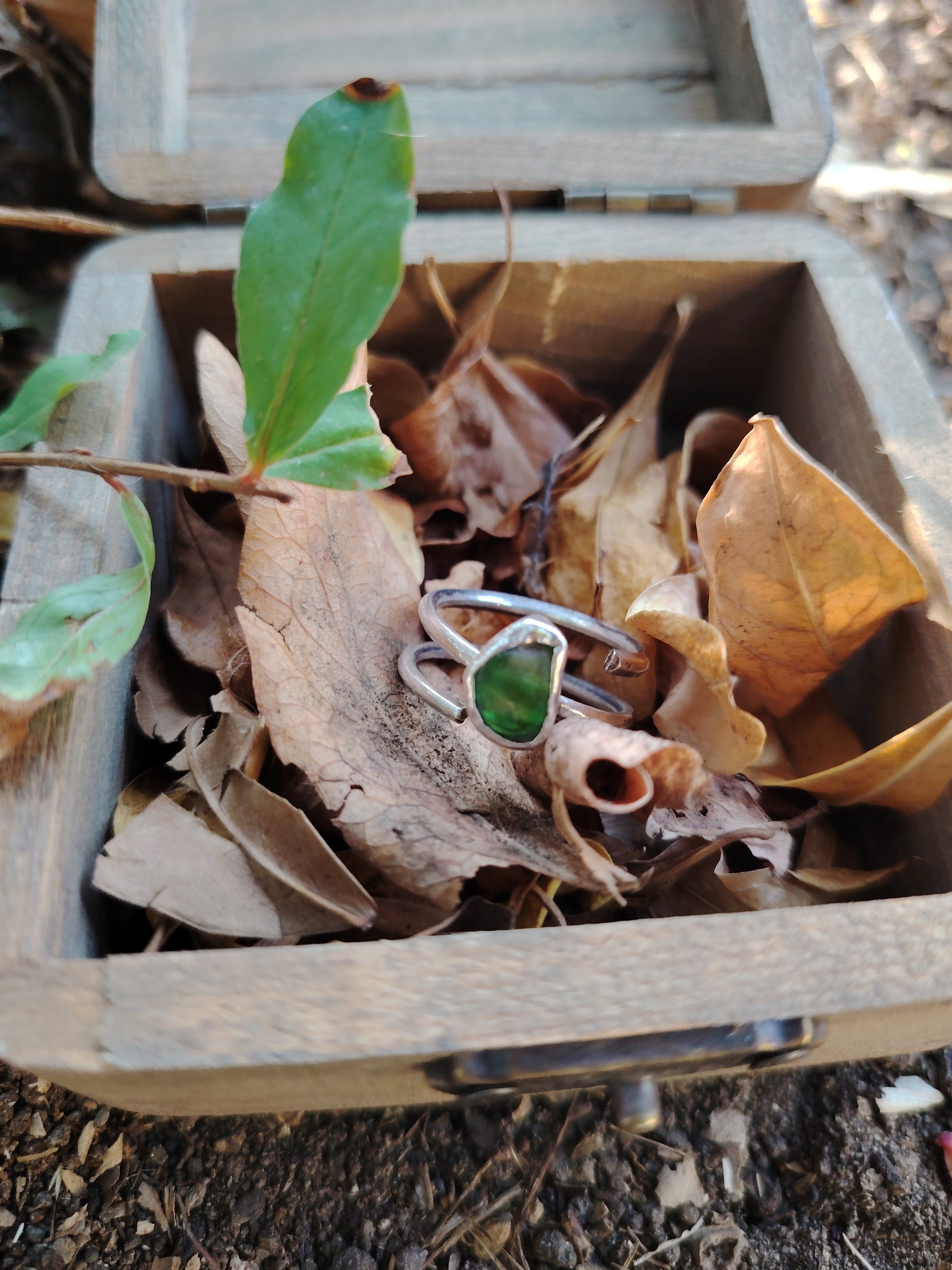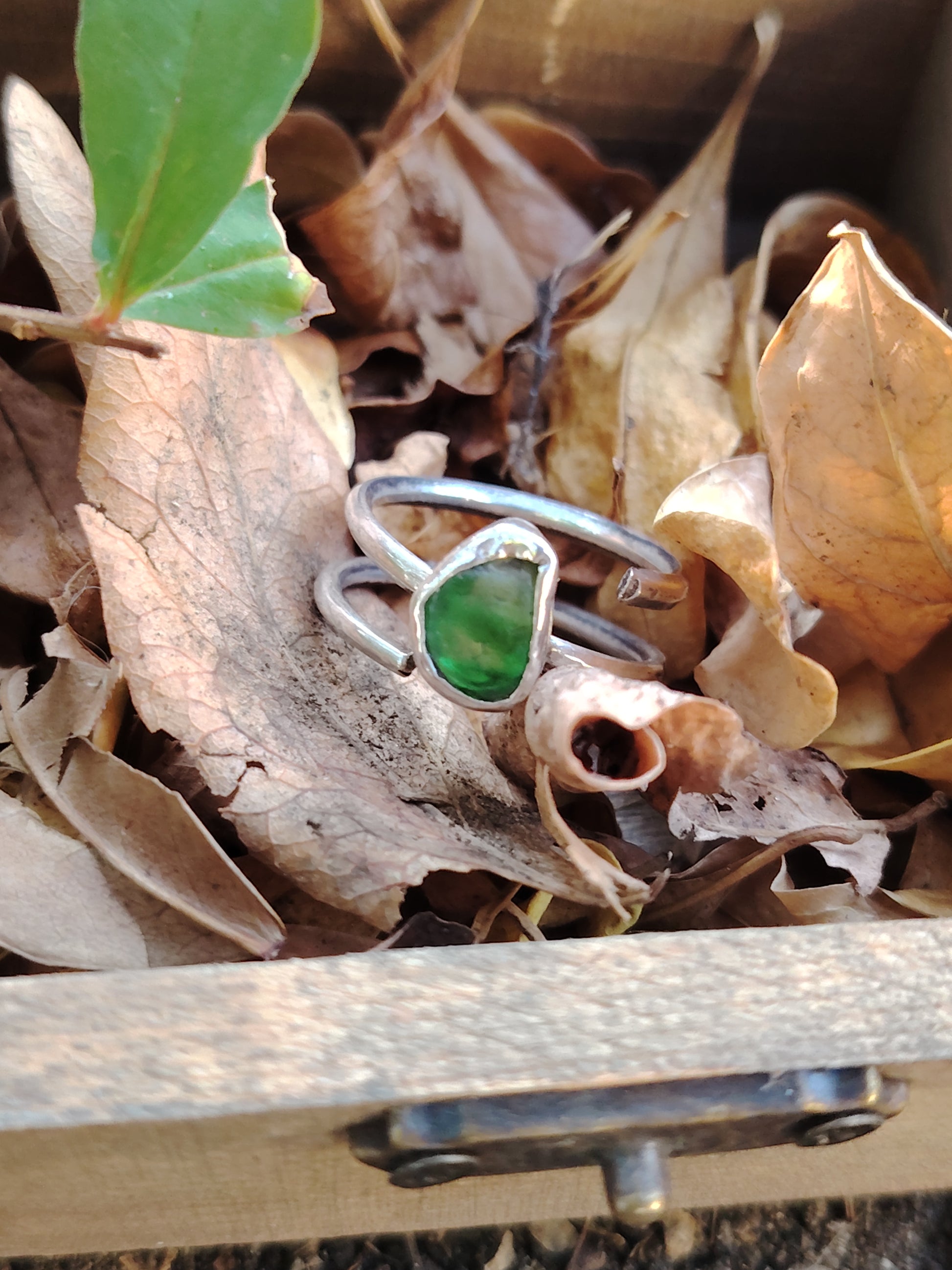 Anello in argento 925 riciclato con ''vetro di mare'' incastonato a mano, parte di una collezione di gioielli realizzata con materiali di scarto in collaborazione con WWF E FAI (fondo ambiente italiano)