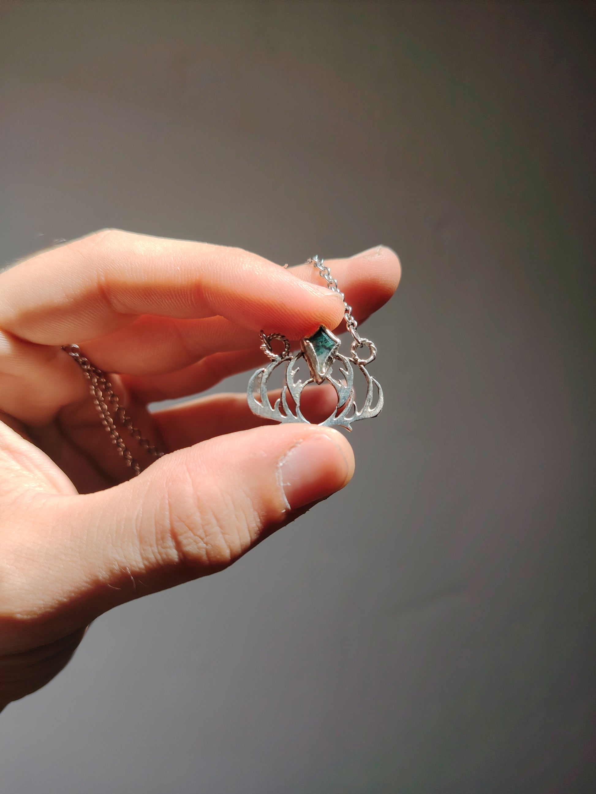 Collana realizzata a mano in argento 925 con agata muschiata incastonata. Ispirata al dio celtico dell'equilibrio Cernunno, di cui il più conosciuto simbolo sono i palchi di un cervo.