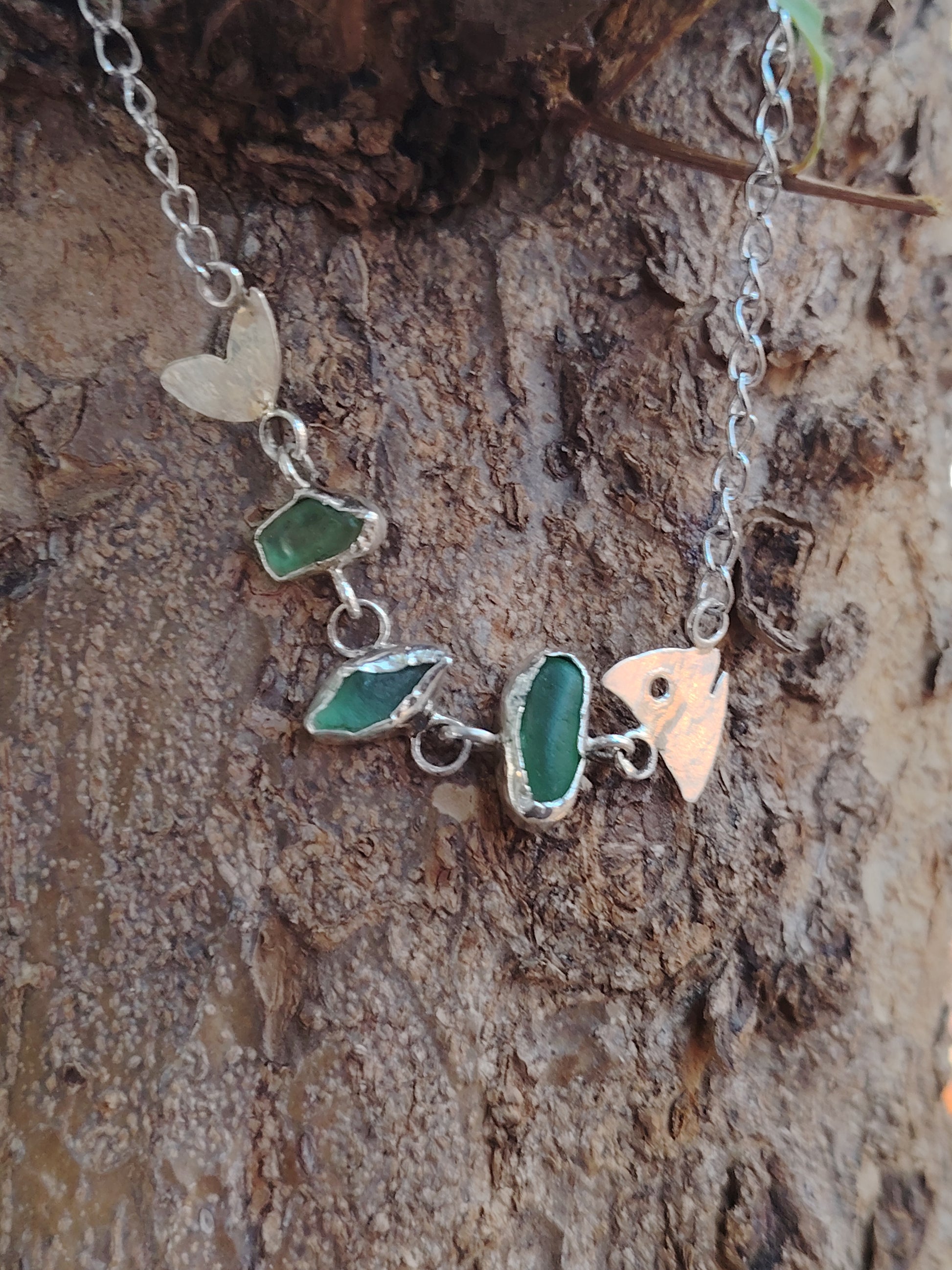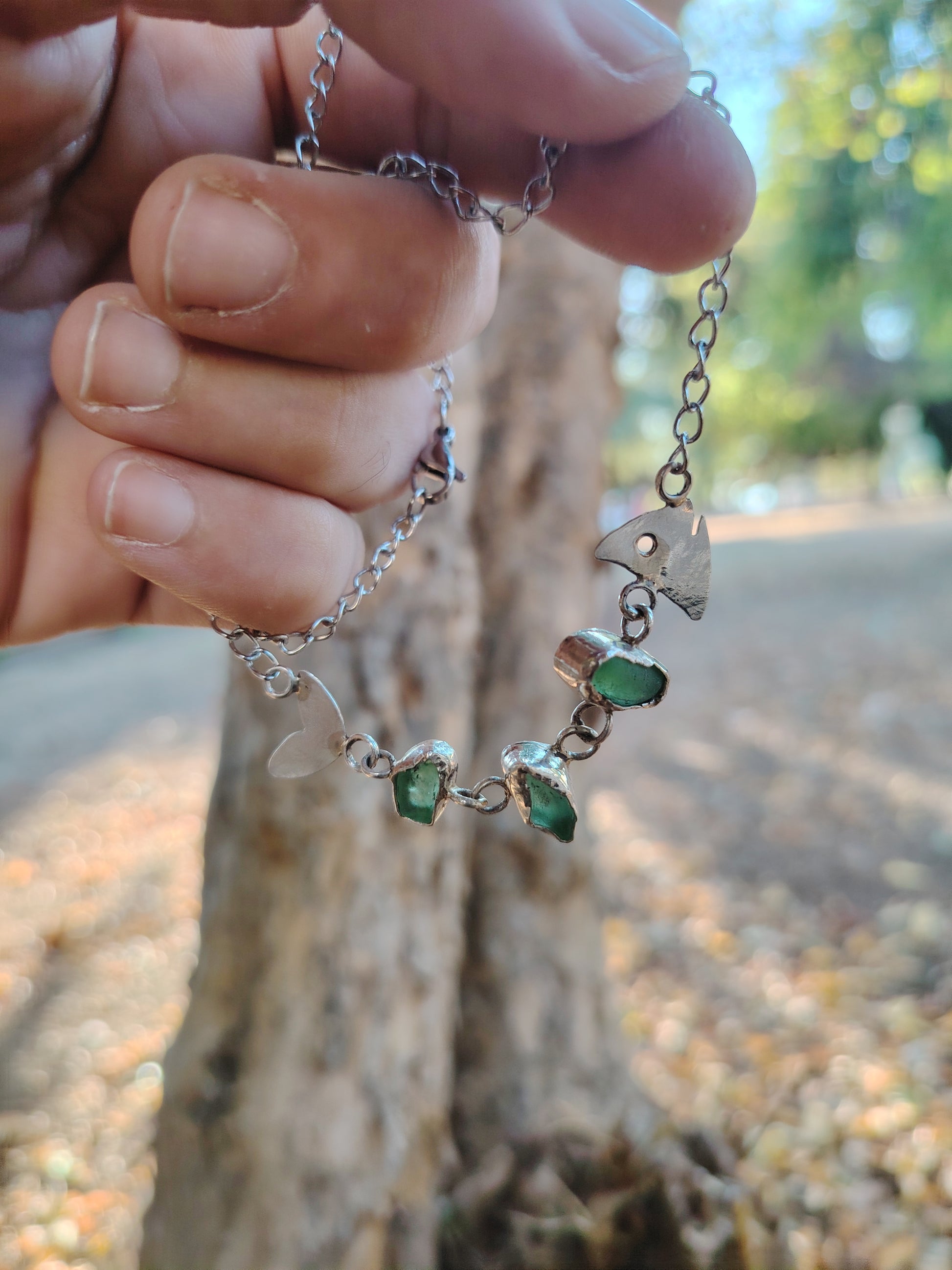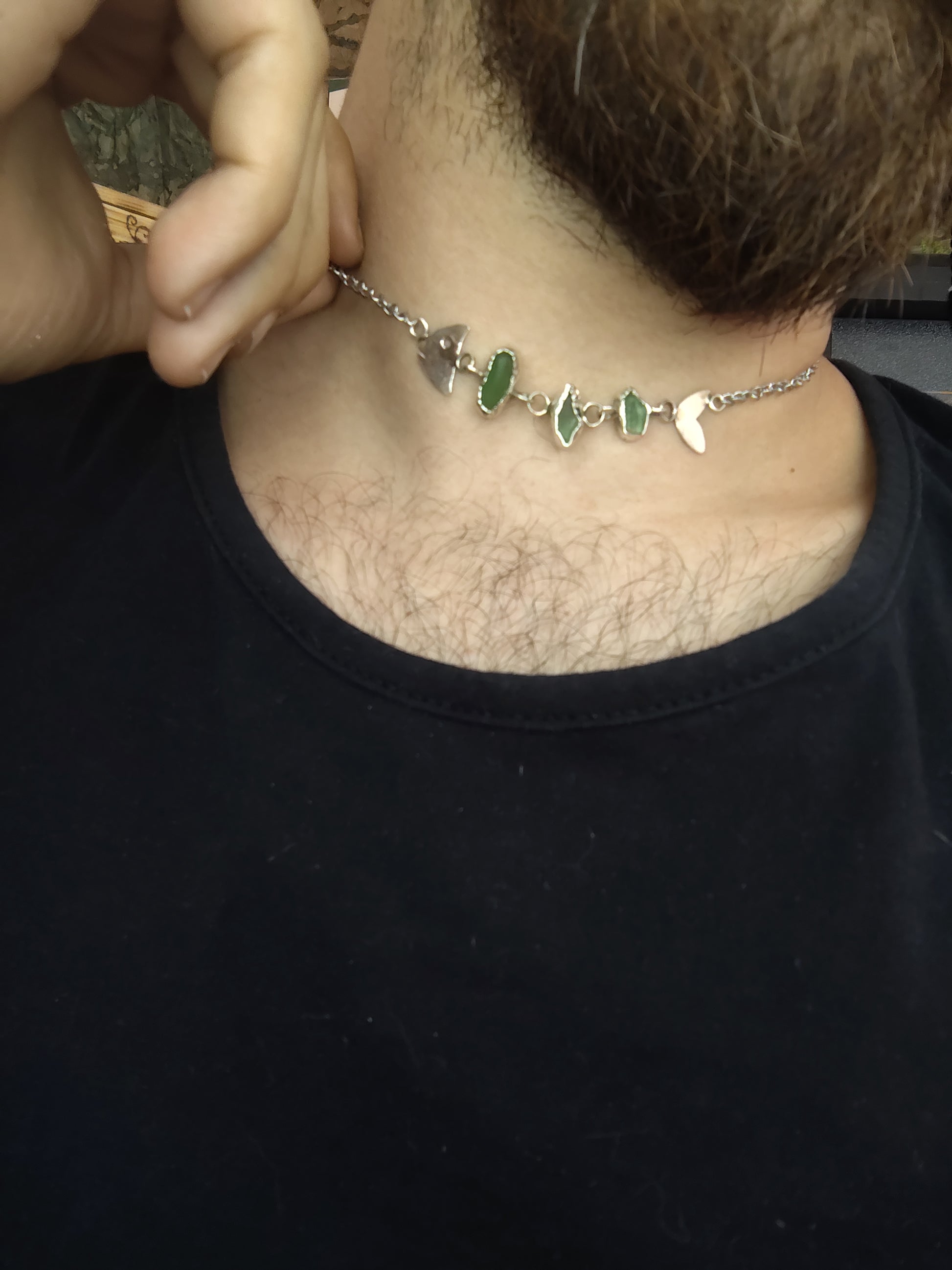 Collana in argento 925 riciclato con ''vetri di mare'' incastonati a mano, parte di una collezione di gioielli realizzata con materiali di scarto in collaborazione con WWF E FAI (fondo ambiente italiano)