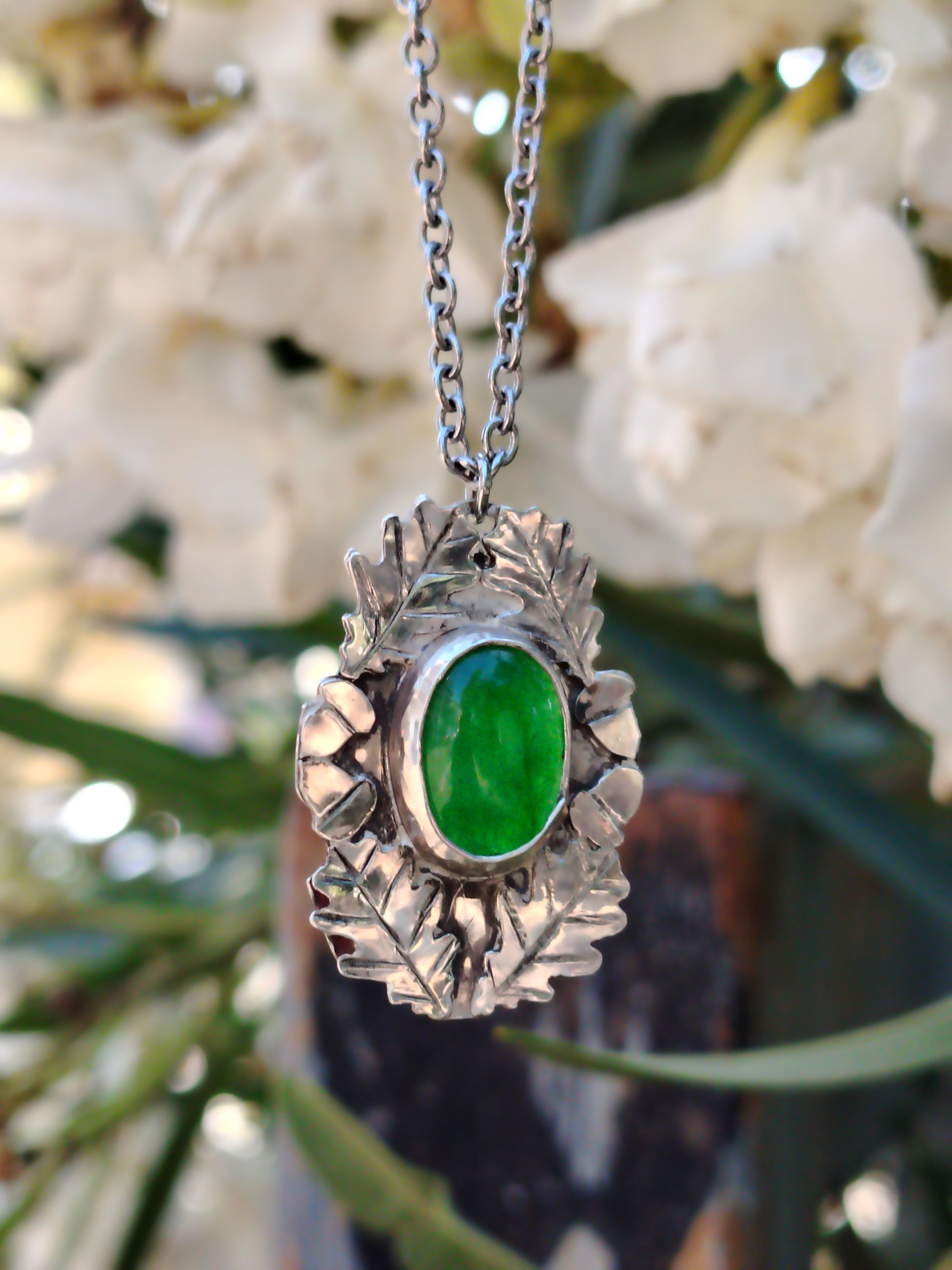 Collana realizzata a mano in argento 925 con giada africana incastonata. Ispirata alla cultura celtica, rappresenta la sacralità delle querce per il popolo dei druidi, le querce rappresentavano la saggezza, la forza, la protezione e da questo sono nate molte leggende.