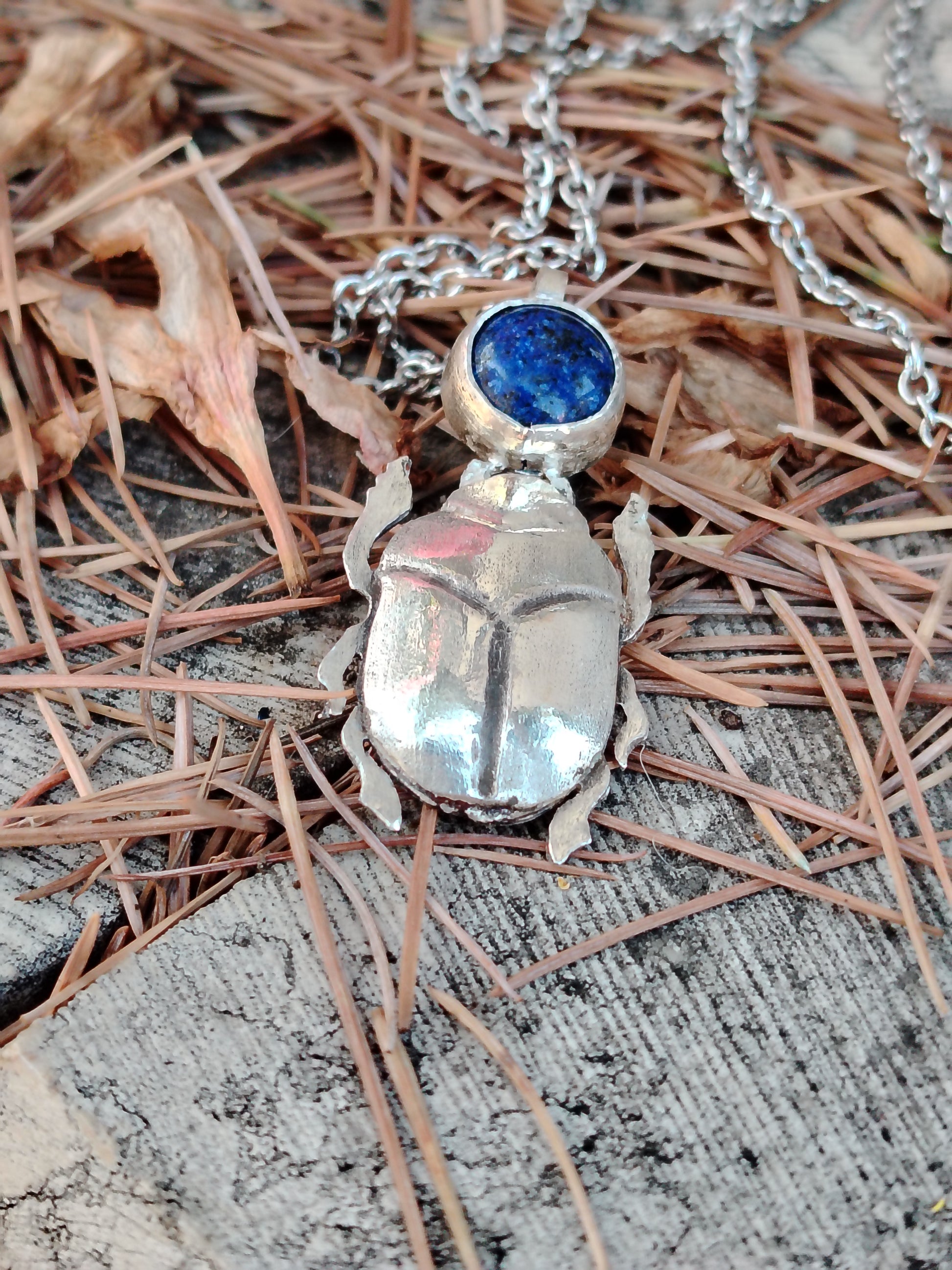 Collana realizzata a mano in argento 925 con lapislazzuli incastonato. Ispirata alla cultura dell'antico Egitto in cui lo scarabeo era simbolo di ciclicità e benevolenza divina.