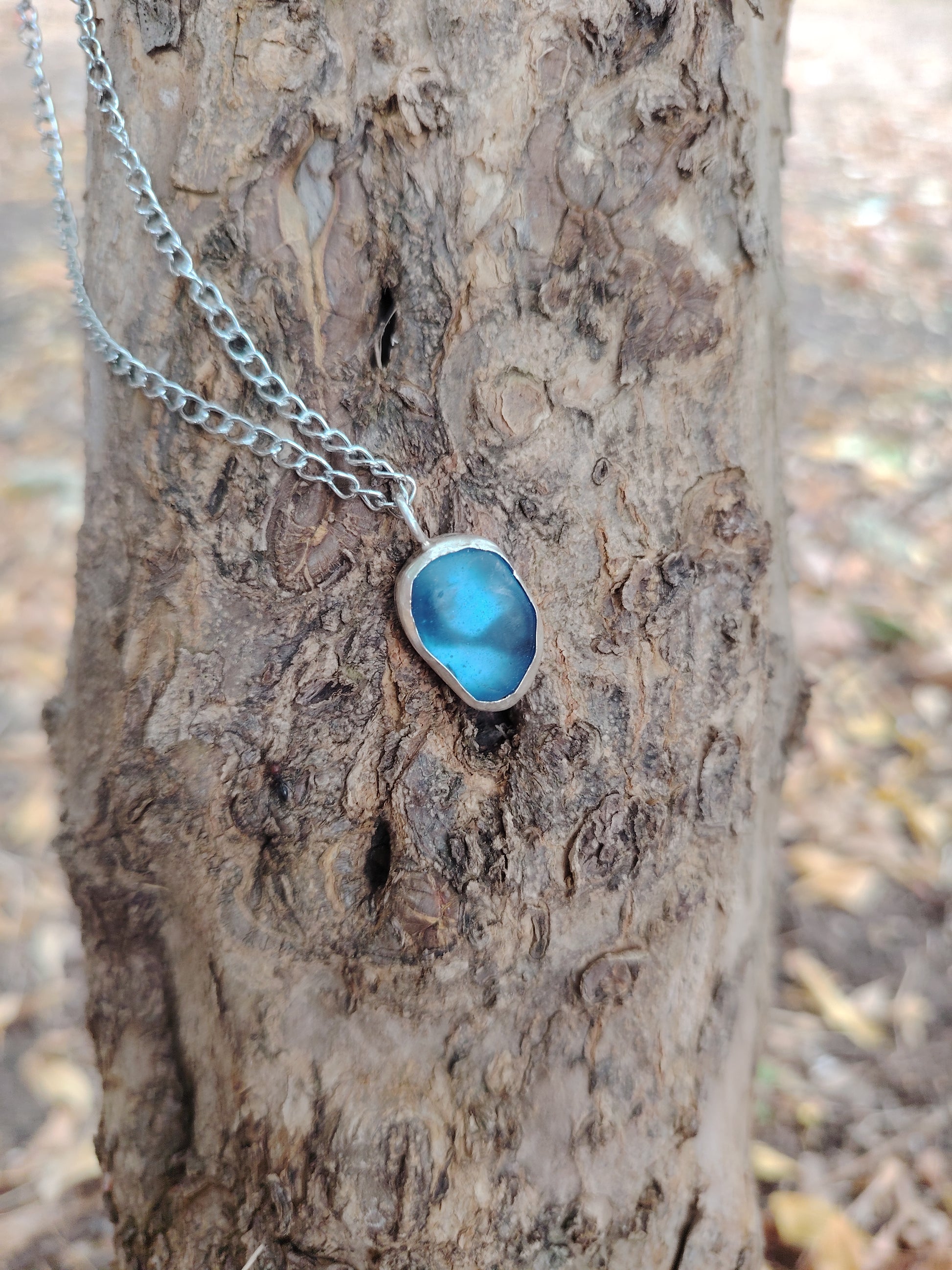 Collana in argento 925 riciclato con ''vetro di mare'' incastonato a mano, parte di una collezione di gioielli realizzata con materiali di scarto in collaborazione con WWF E FAI (fondo ambiente italiano)