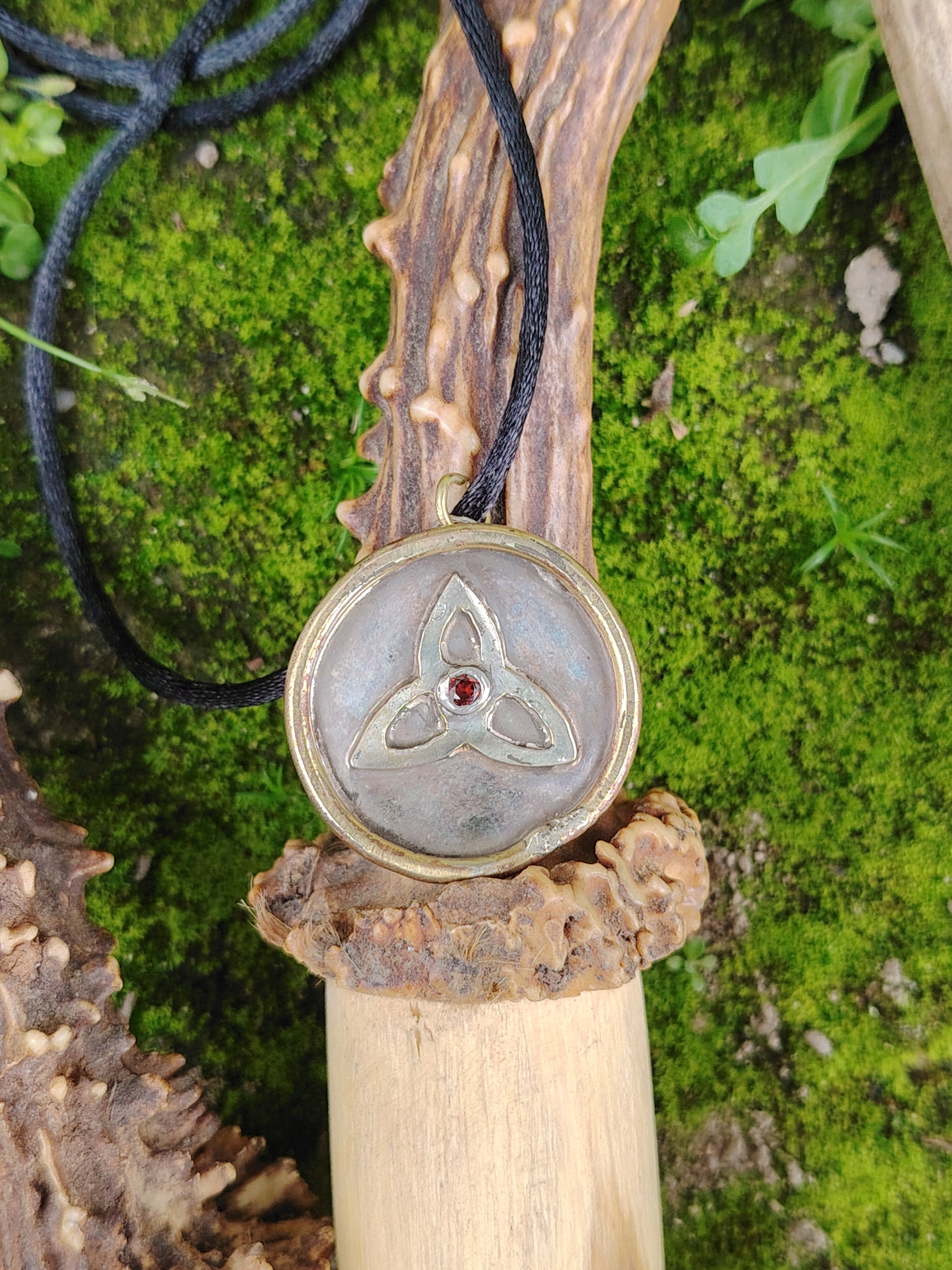 Collana realizzata a mano in argento 925, ottone e granato rosso. Il sacro simbolo (Triquetra) al centro rappresenta il divino femminile, simbolo della Dea Madre Arianrhod per i celti.