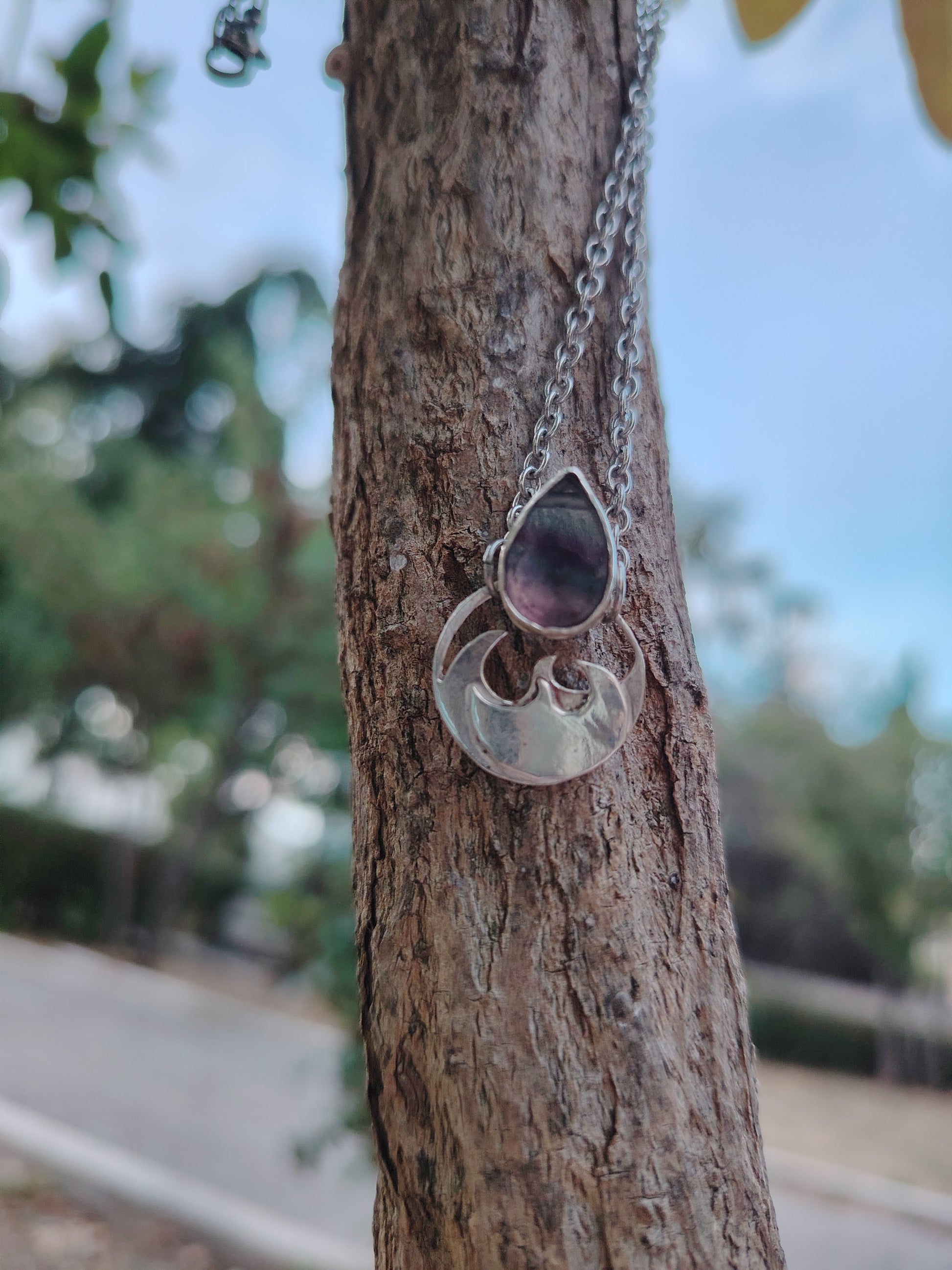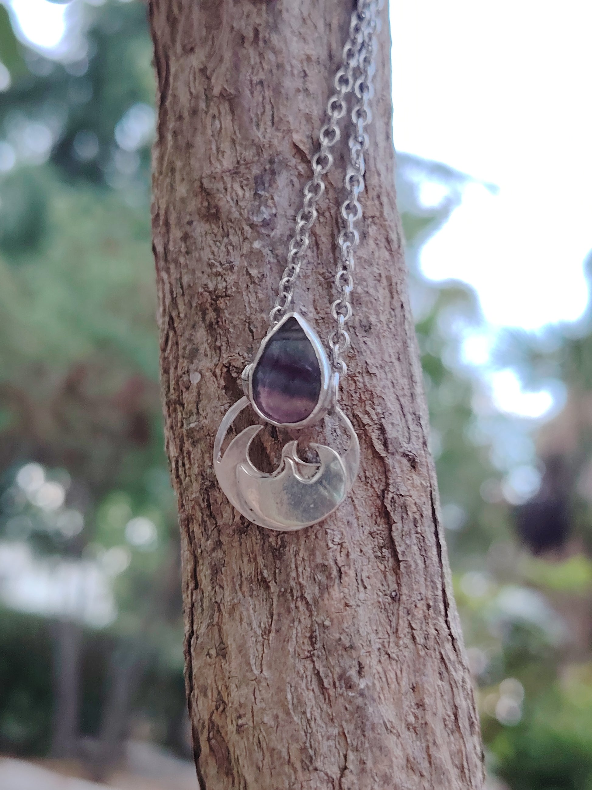 Collana in argento 925 con fluorite arcobaleno incastonata, realizzata a mano ispirata al dominio dei mari del Dio Poseidone.