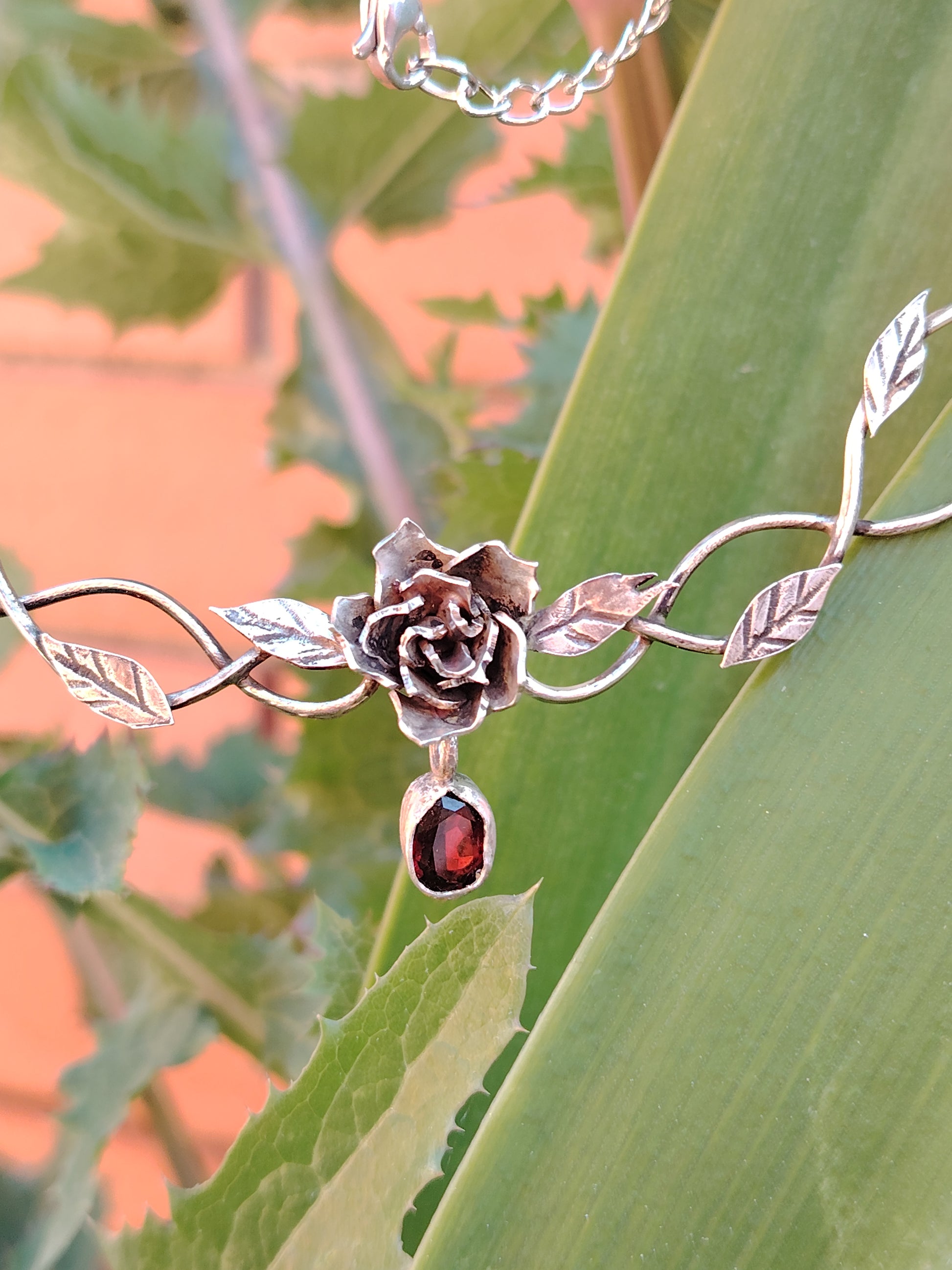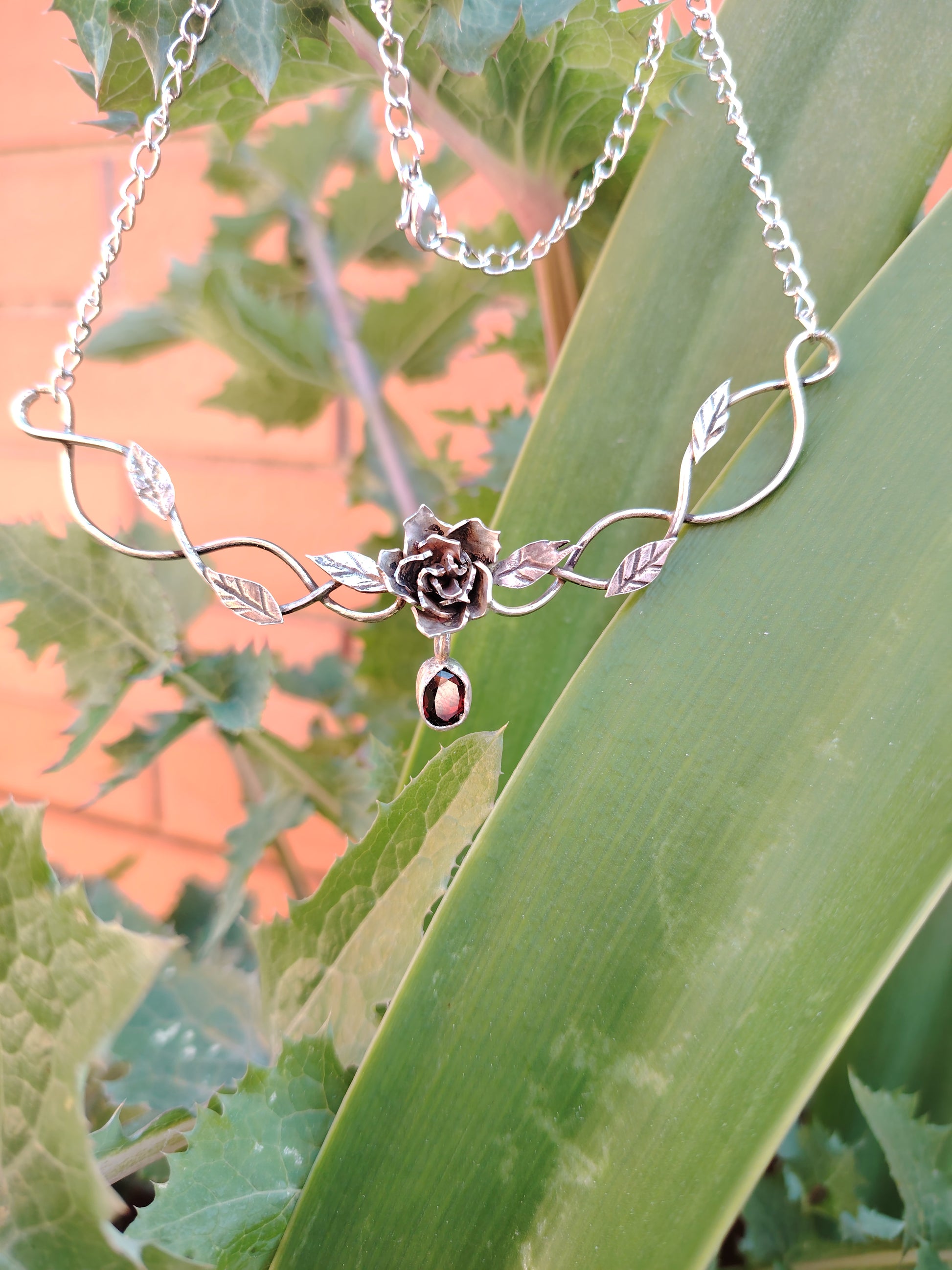 Collana realizzata a mano in argento 925 con granato rosso, ispirata alla bellezza senza tempo e alla profondità delle emozioni più buie e intime